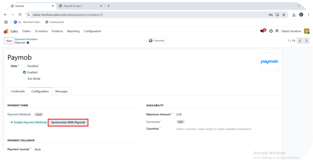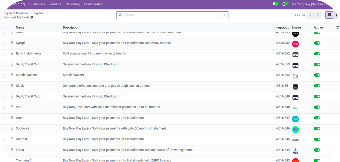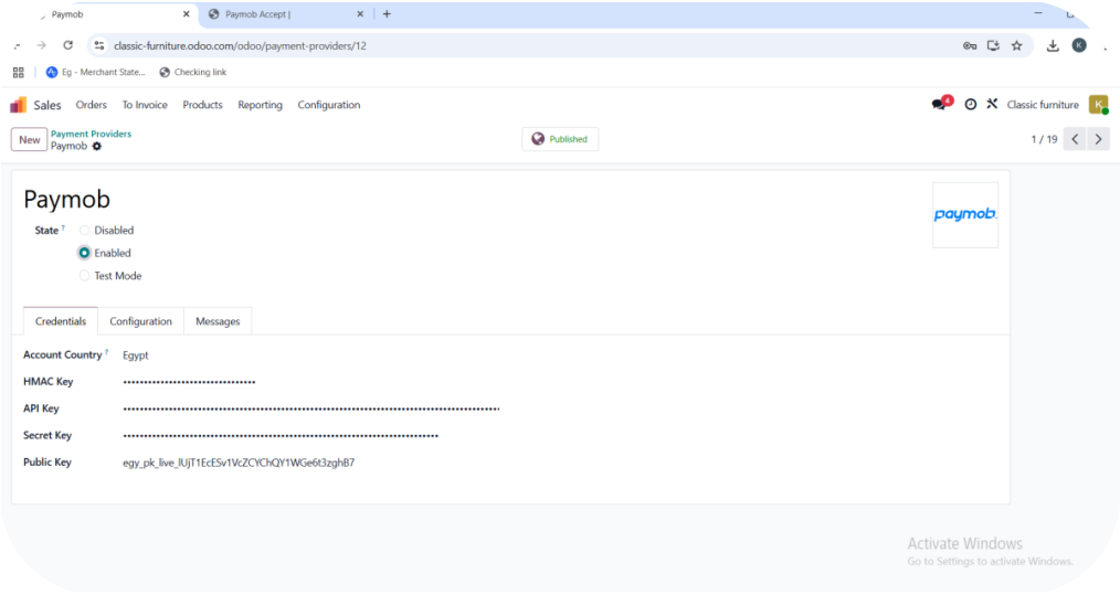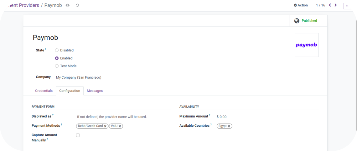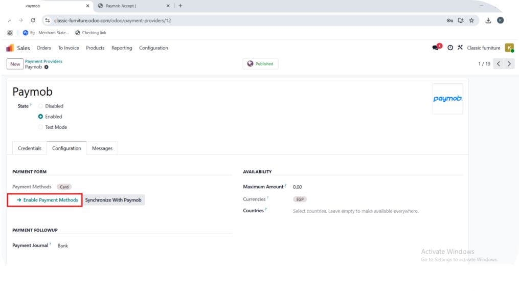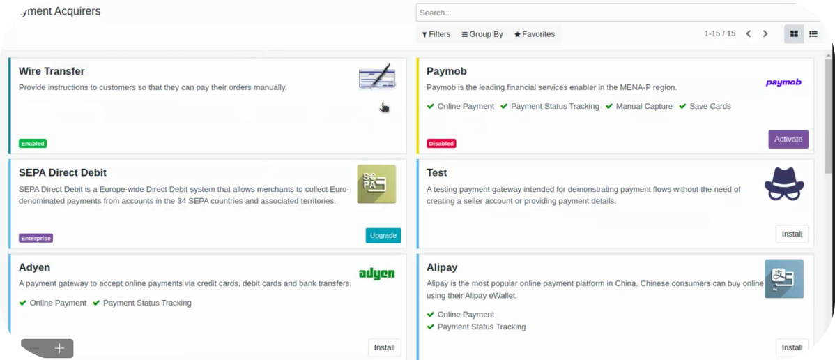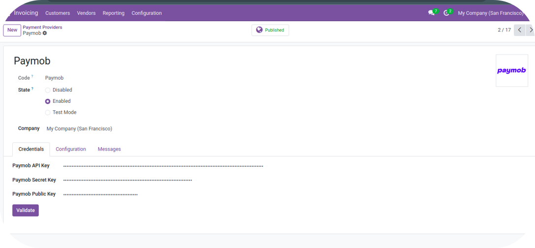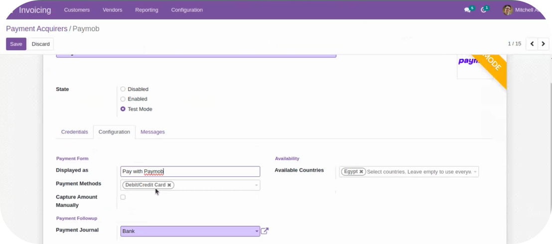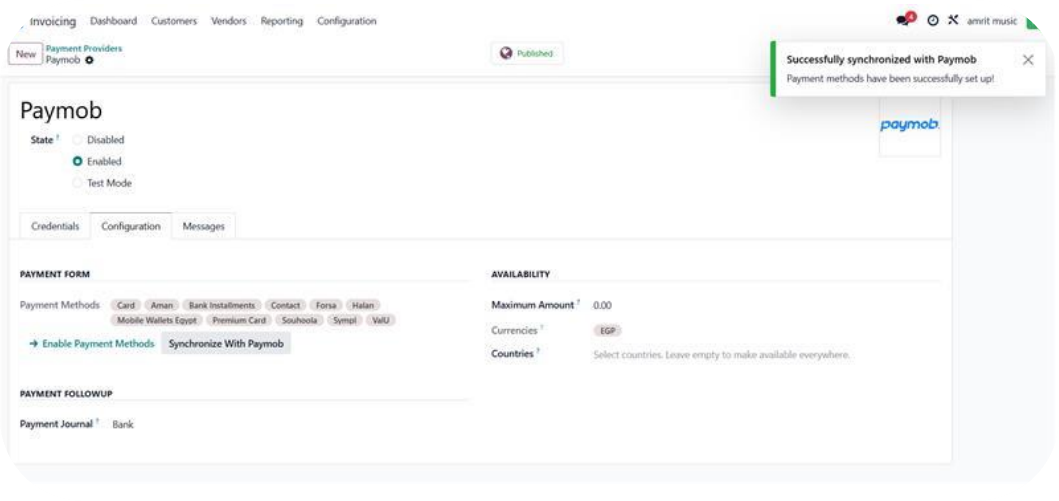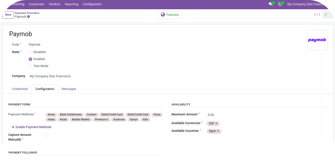 It's the standard version of Odoo and allows its users to utilize all its modules with limited customization. Currently, Paymob is available as a payment provider on its invoicing, sales, website, and e-commerce apps, providing merchants with a streamlined onboarding process and an embedded payment experience.