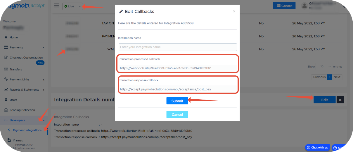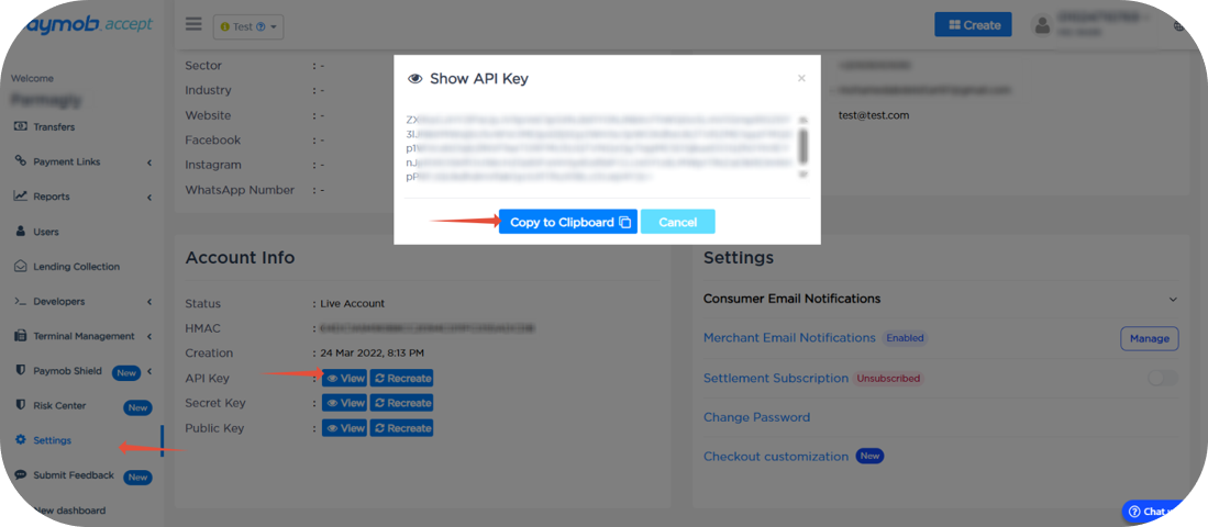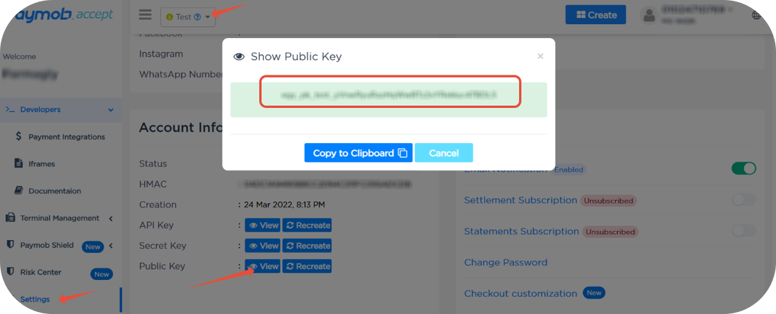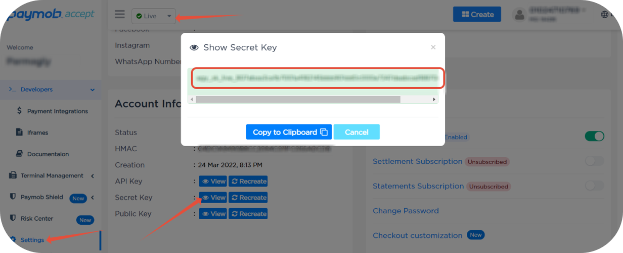 When you integrate with Paymob, even through APIs, Plugins, or Mobile SDKs, you'll need to use some of your Paymob credentials (e.g., secret key, public key, API key, …).